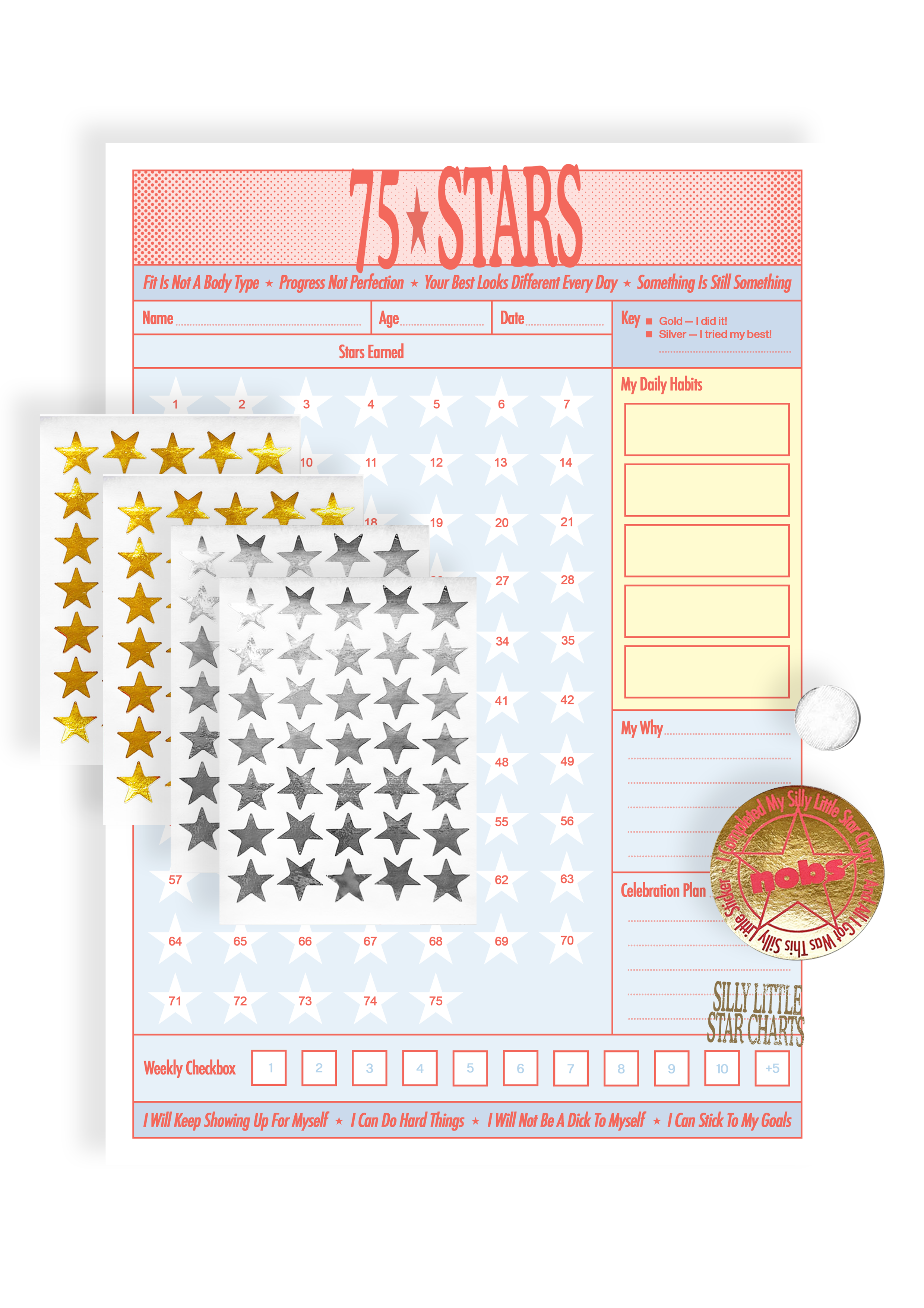 The 75-Stars Challenge has been designed so the workouts and the chart work best together — the chart is what keeps you coming back, motivated, and actually tracking your progress in a way that feels fun.